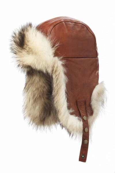 Arctic raccoon trim aviator with cognac lambskin and double d-ring chin strap.
