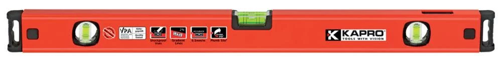 The Kapro Genesis box level has solid acrylic epoxy locked vials as well as the unique dual view Plumb Site vial which allows you to see the vertical vial from the front without having to twist your neck. The horizontal vial shows gradient lines up to 2%. Shock absorbing rubber end caps with wall grip feature help protect the level and make it easy to hold and position.