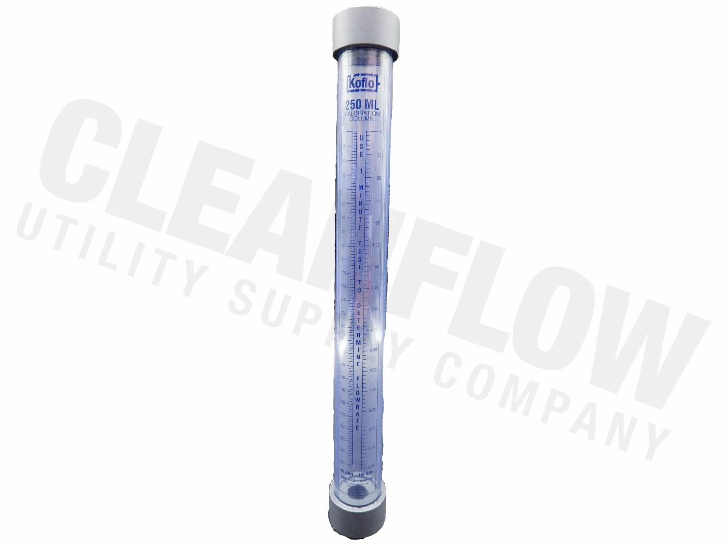 Koflo Metering Pump Calibration Columns provide an easy method for determining pump flow rate using industry standard graduations of mL/min and GPH. An equal starting point for both graduated scales gives the operator both mL/min and GPH in one test.