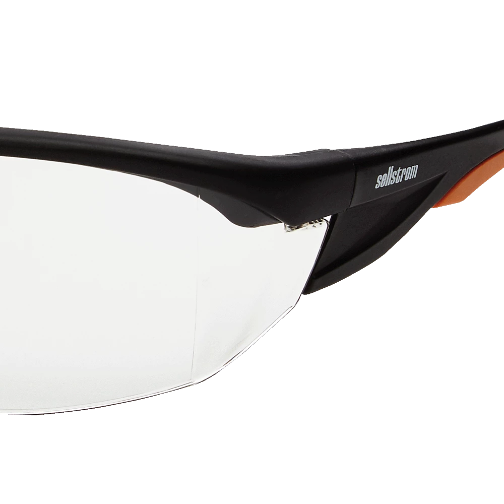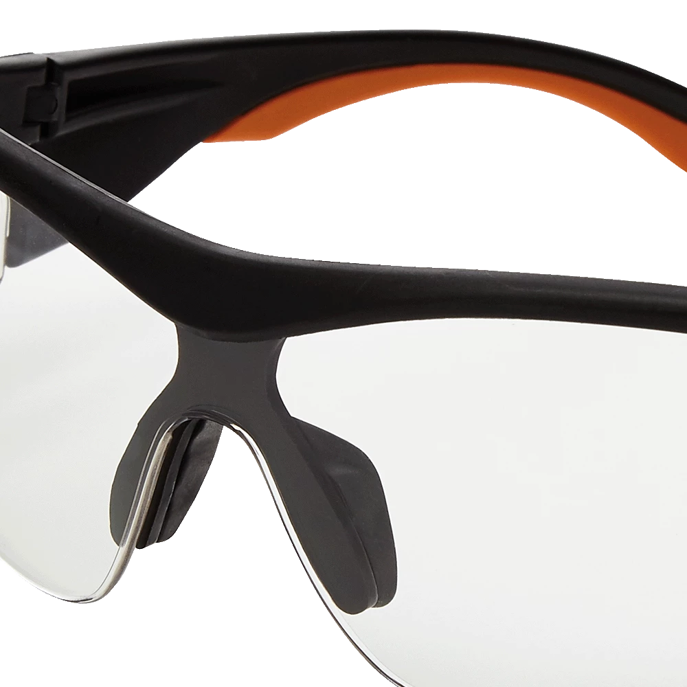 • Stylish flat black and orange co-molded temples are soft and flexible