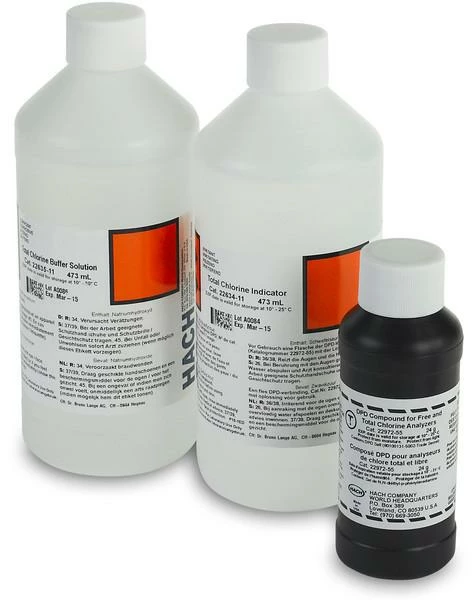 Set contains: DPD Free & Total Chlorine Indicator Powder, 25 Grams (2297255) Free Chlorine Indicator Solution, 473 ml (# 2314011) Free Chlorine Buffer Solution, 473 ml (# 2314111)